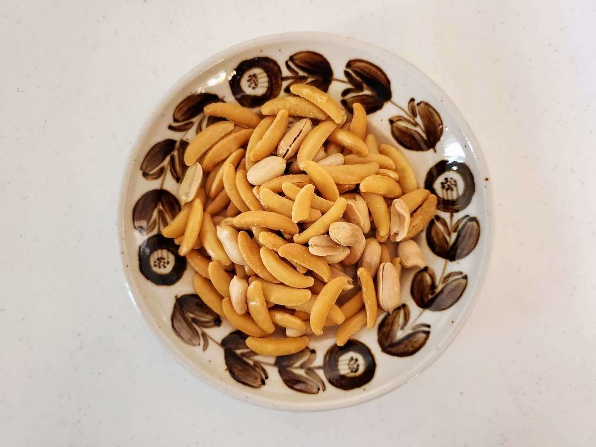 普通の柿ピーに比べると、やや色味が薄いかなという印象。