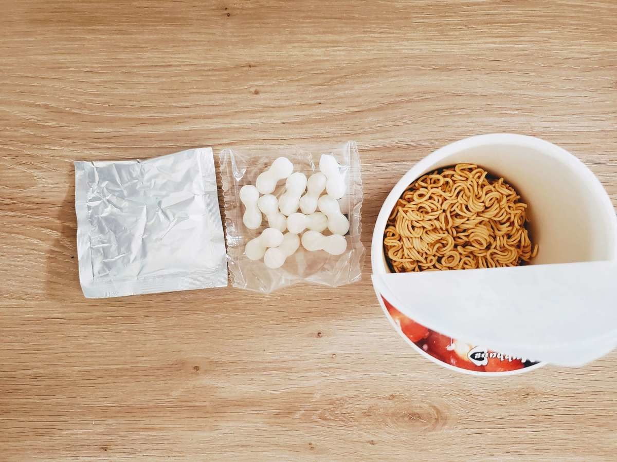 蓋を剥がすと、中には粉末ソース、トッポキ、麺が入っています。