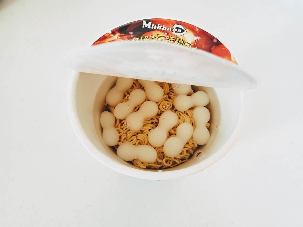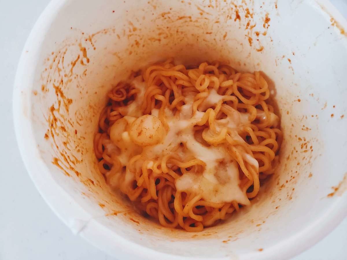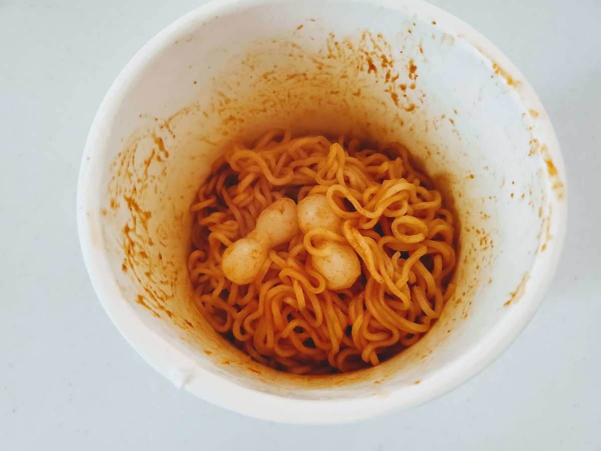 粉末ソースの量で辛さを調節するとのことで、まずは3分の2程度入れてみました。下の麺はよくあるカップラーメンの食感で、トッポキのもちもち感と意外にも相性良しです。ニンニクが香るクセになるジャンクな味わいは、まさに韓国の屋台の味!辛さは程よく、辛いものが得意な方はソース全量入れてみてもいいかも。