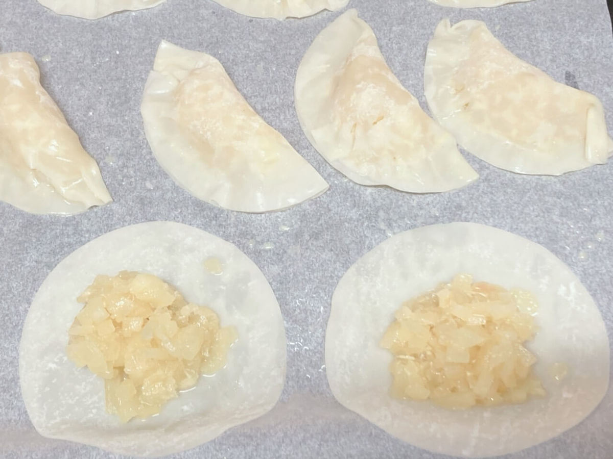 ③加熱した②をよくかき混ぜ、なるべく汁が入らないように餃子の皮(1枚)の中心に小さじ2をのせ、半月包みで包む