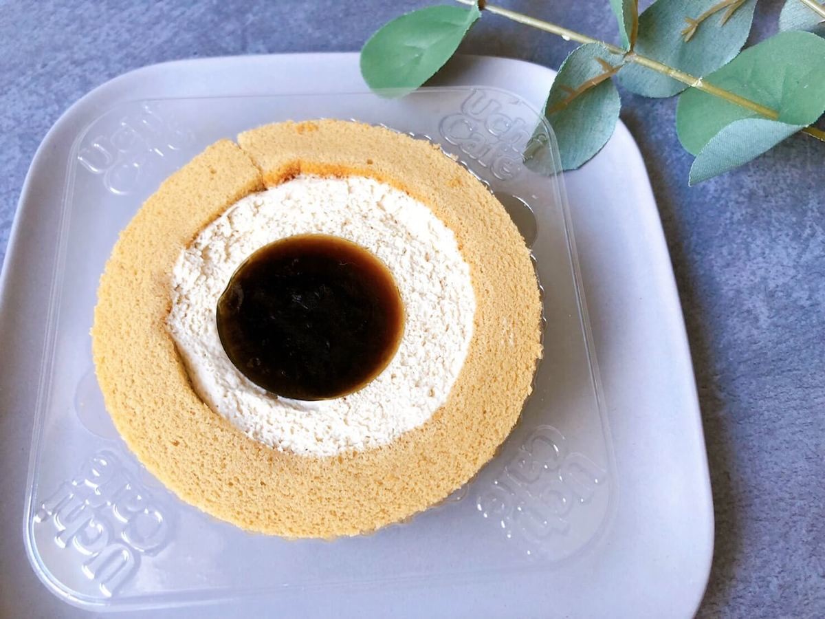 真ん中の黒い部分は黒蜜ゼリー。沖縄県産黒糖の黒蜜を使用したしっとりとしたロール生地に、黒蜜を合わせたクリームとソースを絞り、黒蜜のもっちりとしたゼリーをトッピングした、黒蜜尽くしのスイーツです♪