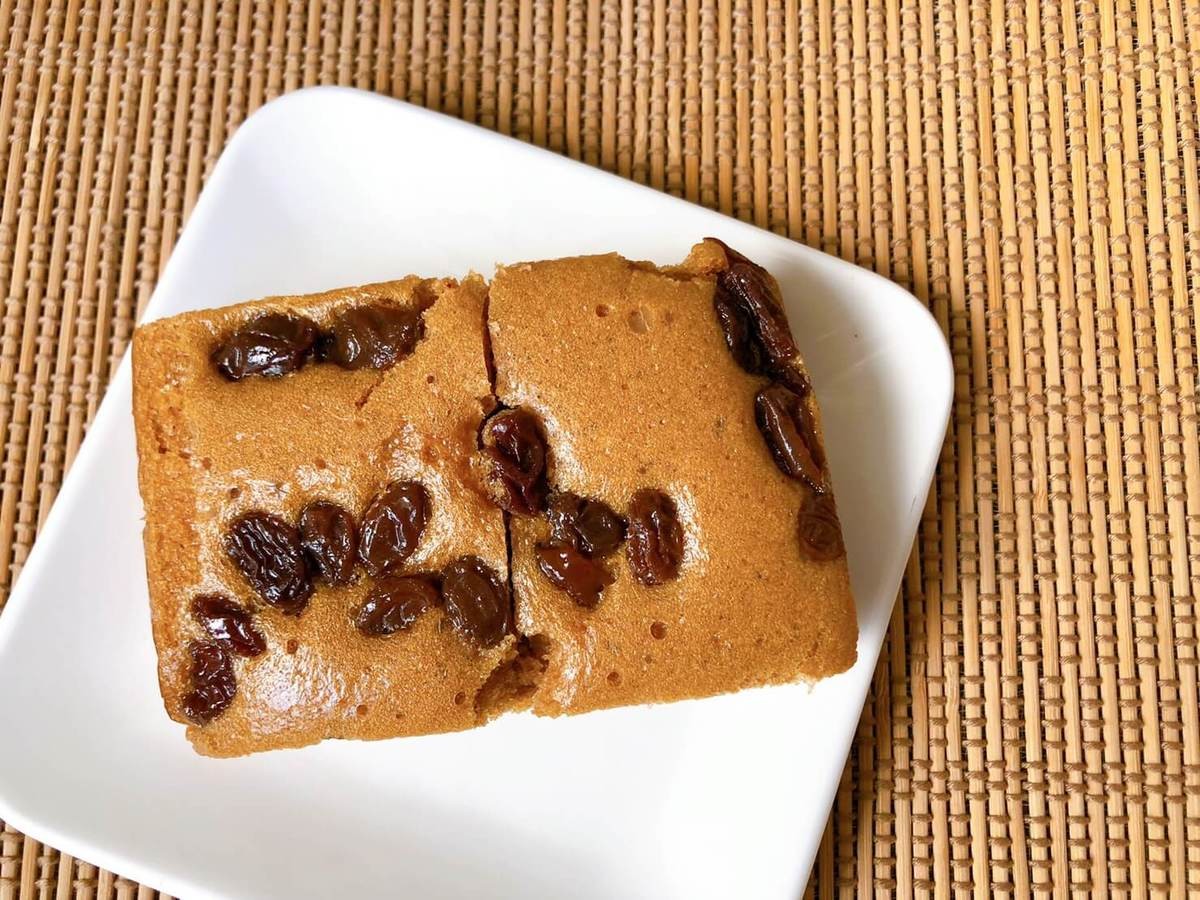 蒸しパンはほどよくずっしりしているものの、食べてみるとふわっとしています。生地自体の甘さは控えめで、ガッツリ甘く漬け込まれたレーズンが良いアクセントに。