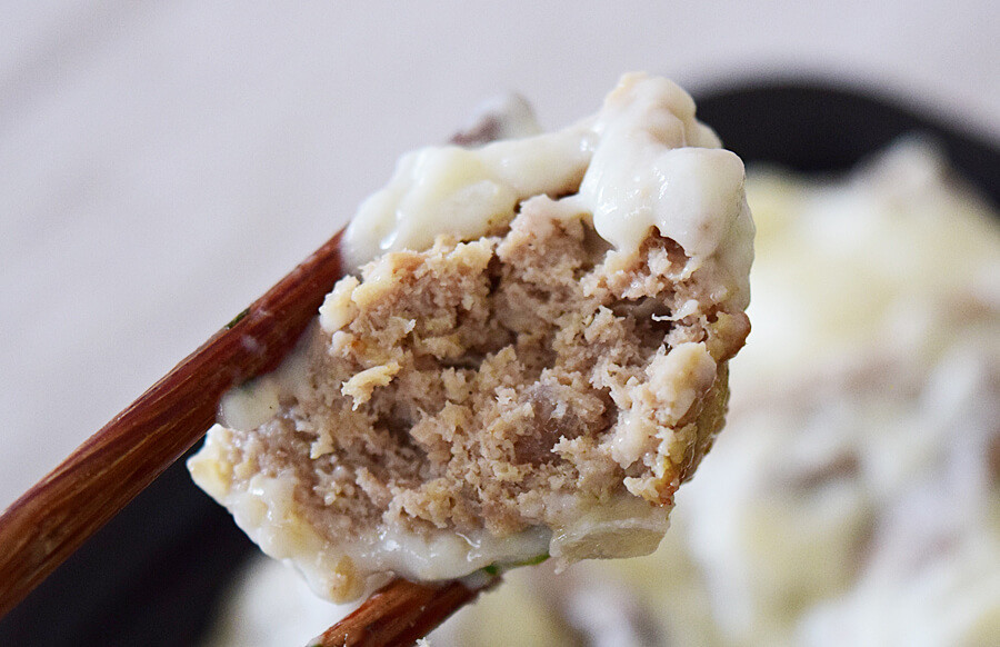 ホワイトソースがかかったミートボール。なんだろう、このIKEA感。ロピアでまさかのIKEAっぽい惣菜がみつかるとは思いませんでした。