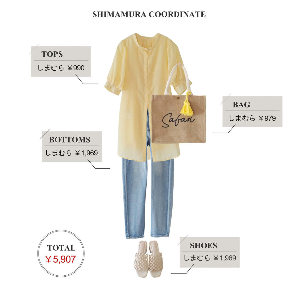 イエローのブラウスを主役にした夏のカジュアルコーデ。