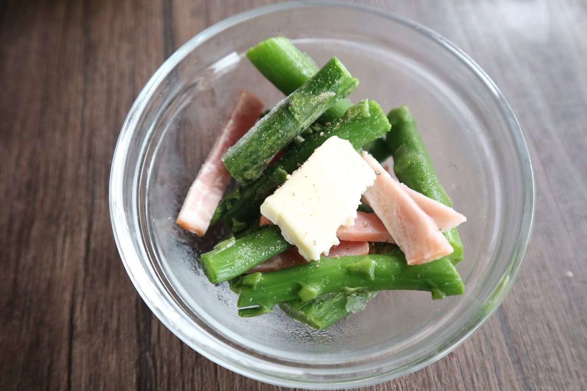 耐熱ボウルに、アスパラとベーコンを1/2袋、バター2.5g、塩ひとつまみ、ブラックペッパー適量を入れて、ふんわりラップをかけて600Wの電子レンジで1分30秒加熱。