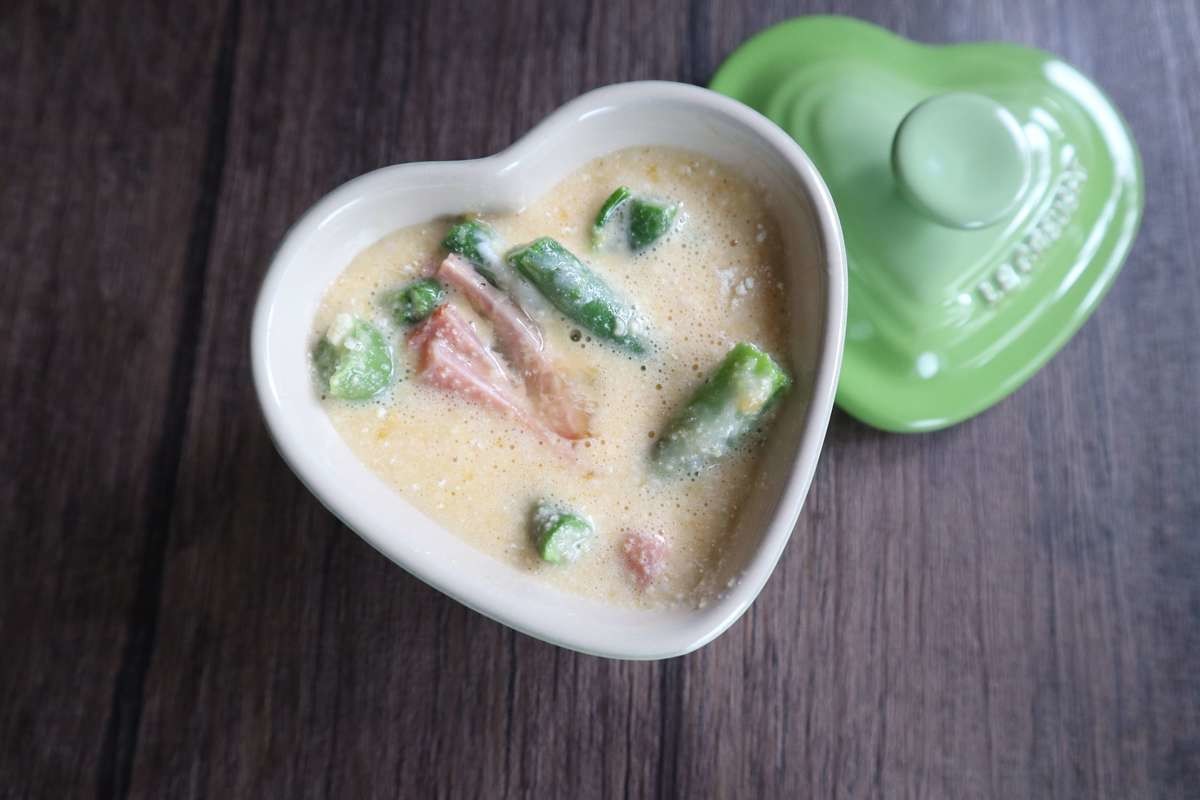 ボウルに卵1個、アスパラとベーコン1/2袋、牛乳大さじ1、粉チーズ大さじ1、塩ひとつまみ、ブラックペッパー適量を加えて混ぜる。