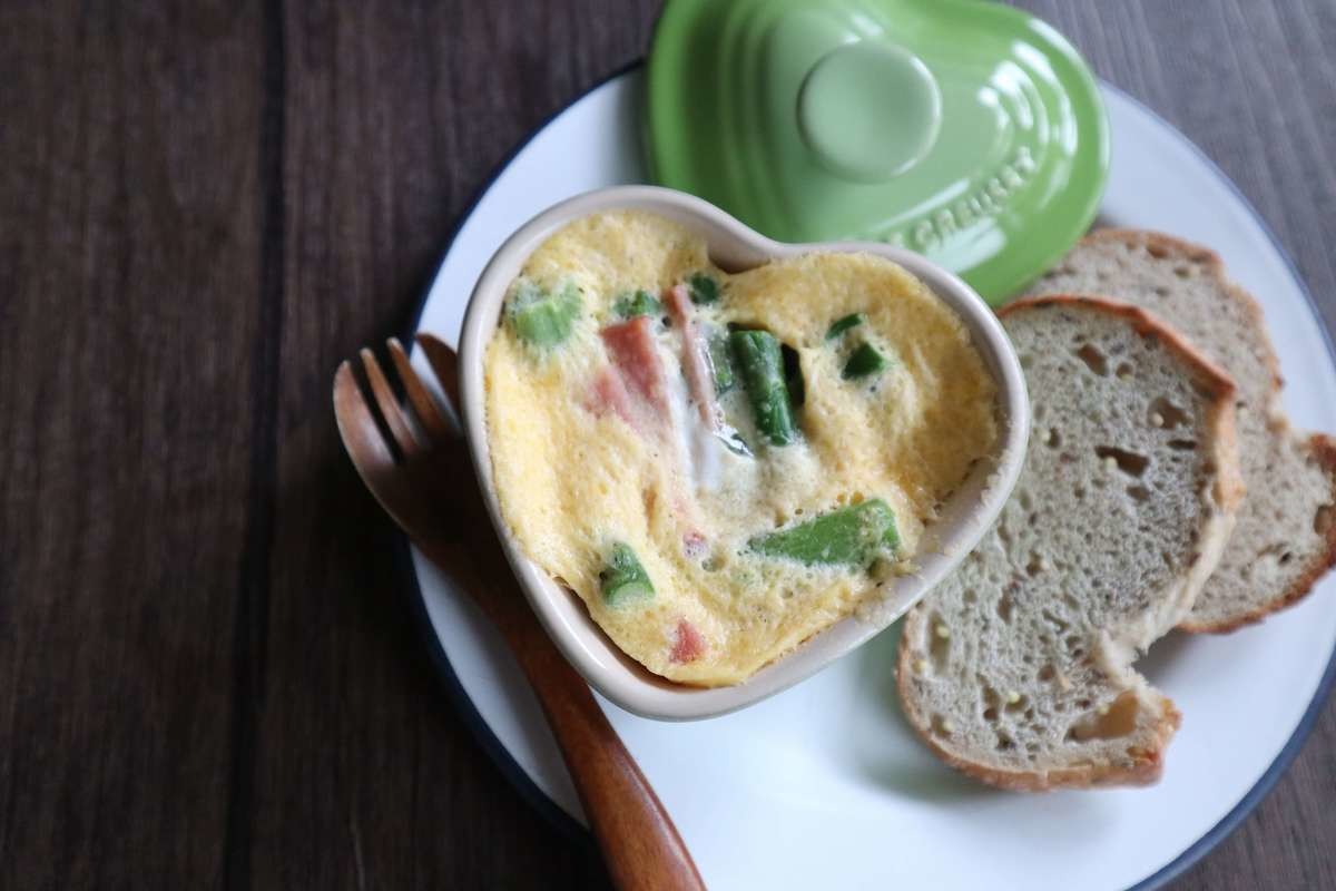 【電子レンジでキッシュ】の完成。パンを添えれば朝食にぴったりです。 お好みでケチャップかけても美味しく食べられます。