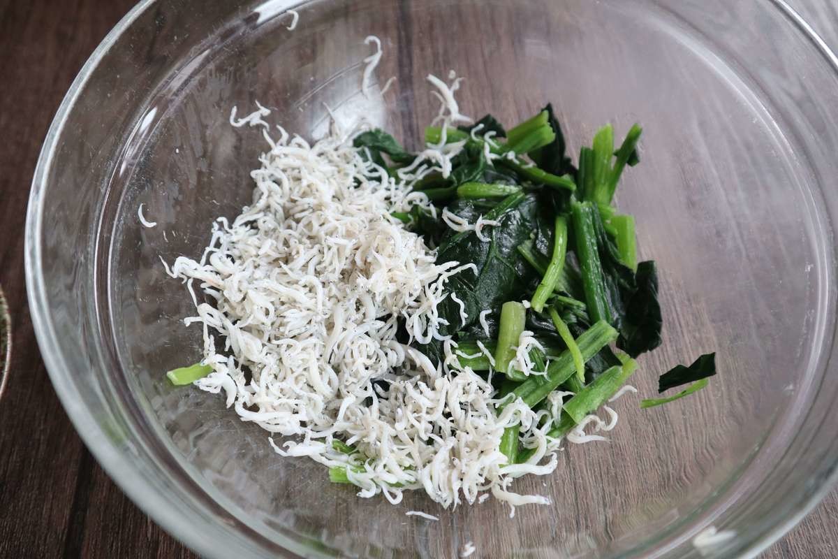 ボウルに加熱したほうれん草1/2袋、しらす大さじ3、めんつゆ3倍濃縮大さじ1/2を混ぜたら完成。