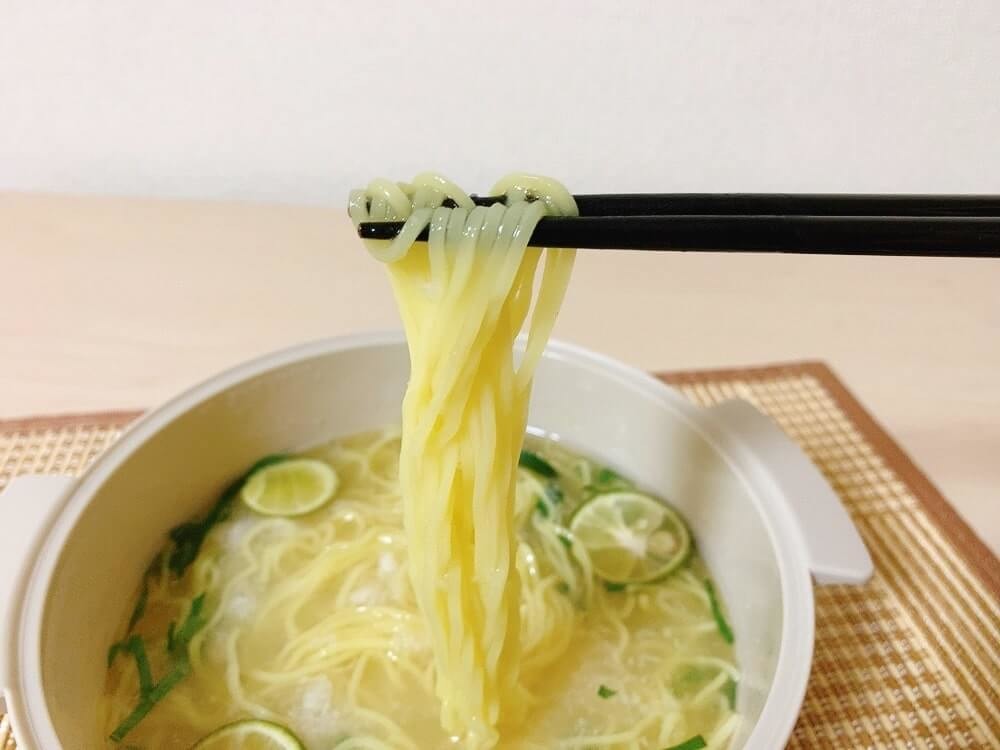 北海道産の小麦粉を使用した細目の麺は、スープによく絡んでシークヮーサーの味をたっぷりと感じさせてくれます。