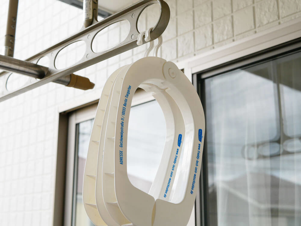 白を基調とした清潔感あるベースに、ブルーの可愛いロゴがアクセント。物干し竿にかけられるフック付で枕やクッションも干せたりと機能性もばっちりです。