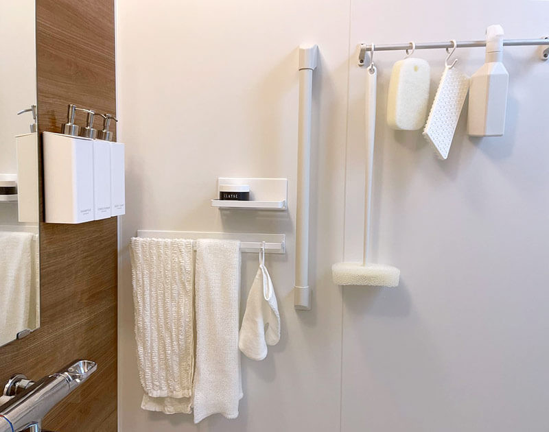 ラックに置いて収納していた全てを、子どもの手が届かない吊るす収納へチェンジすることで、シャンプー中のいたずらがなくなったのはもちろん、ラックを掃除する手間がなくなり、家事もはるかに楽ちんになりました。