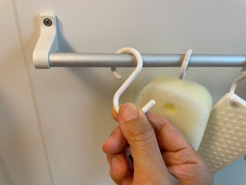 以前は金属のS字フックを使用していたので、子どもがぶらぶらと揺らすだけで、すぐカランとはずれて落下してしまい、柄の長いブラシを子どもから取り上げ、何度もフックをかけ直す、なんてこともしばしば。