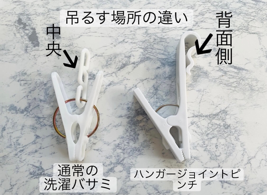 通常の洗濯バサミは中心に吊る場所がありますが、こちらのハンガージョイントピンチは背面側にあり、シンプルでスッキリした見た目です。