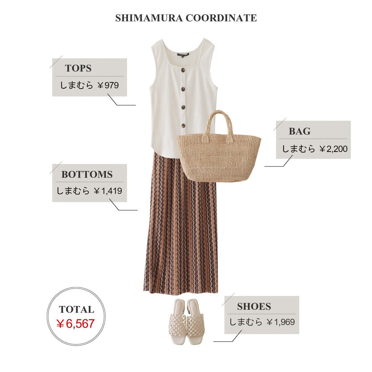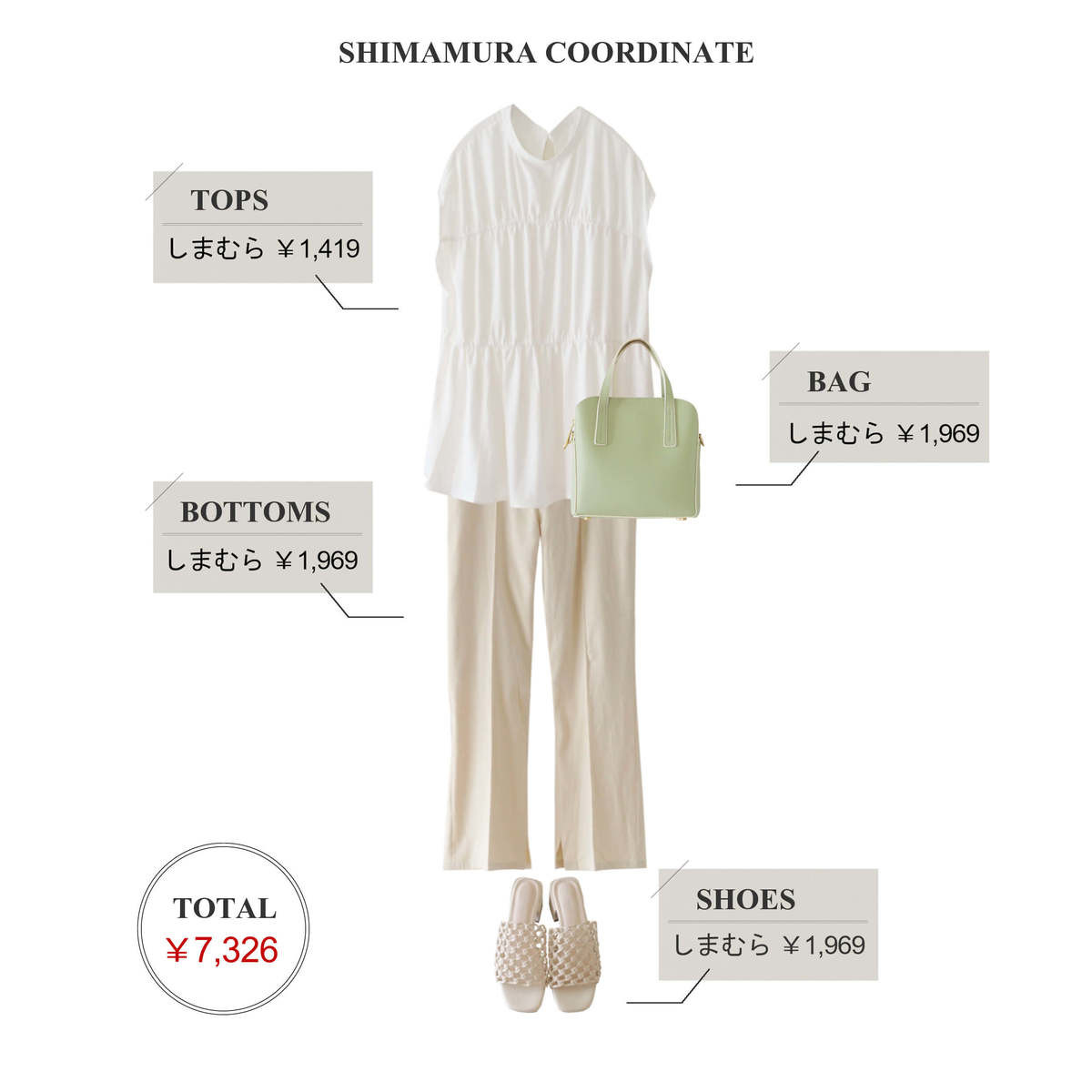 重たく見えないように、バッグとサンダルはアイボリーを選びました。
