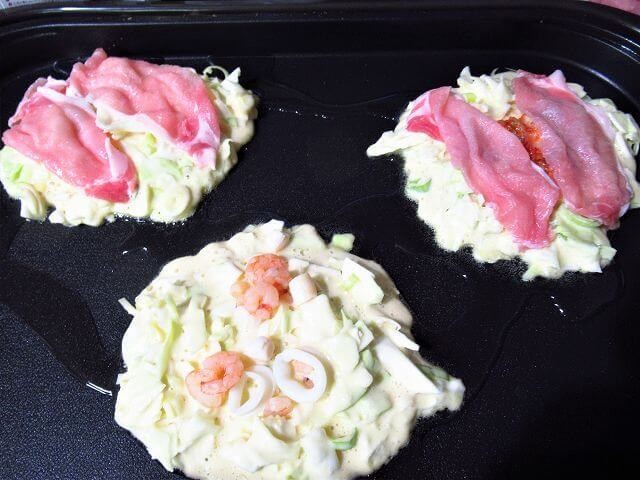 わが家ではそれぞれ好みが違うので、キャベツとネギだけ合わせたものを基本の生地とし、焼くときに具材を乗せる方法で作っています。