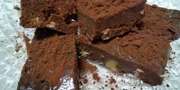冷やし固まったチョコを切り分け、あればココアパウダーを振りかけます。