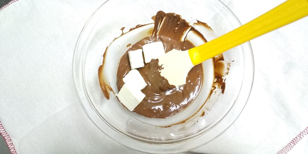 ③溶かしたチョコにクリームチーズ(54g)と砕いたナッツを入れ、よく混ぜ合わせる