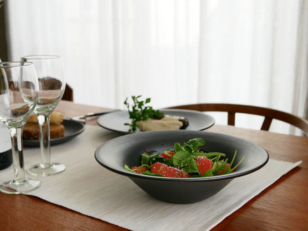 黒色の食器をいつものテーブルに並べるだけで、簡単に洗練されたモダンな仕上がりになるんです。 普段のサラダもこんなに上質で高級感がでるんだから、すぐにでも取り入れたい器です。