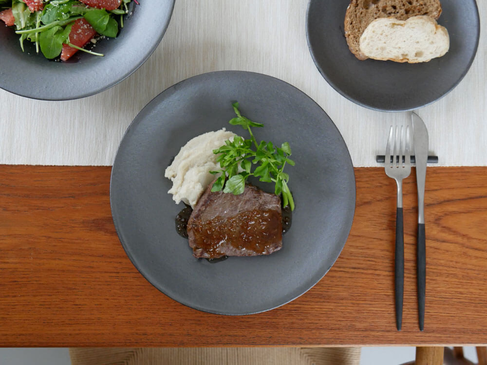 「プレート 25.5cm」のお皿はメインディッシュ用にちょうどいいディナープレートサイズ。メインのお肉やお魚料理にGOOD。 マットな黒色にしかだせないラグジュアリー感で、特別な食事をさらに格上げさせてくれますね。