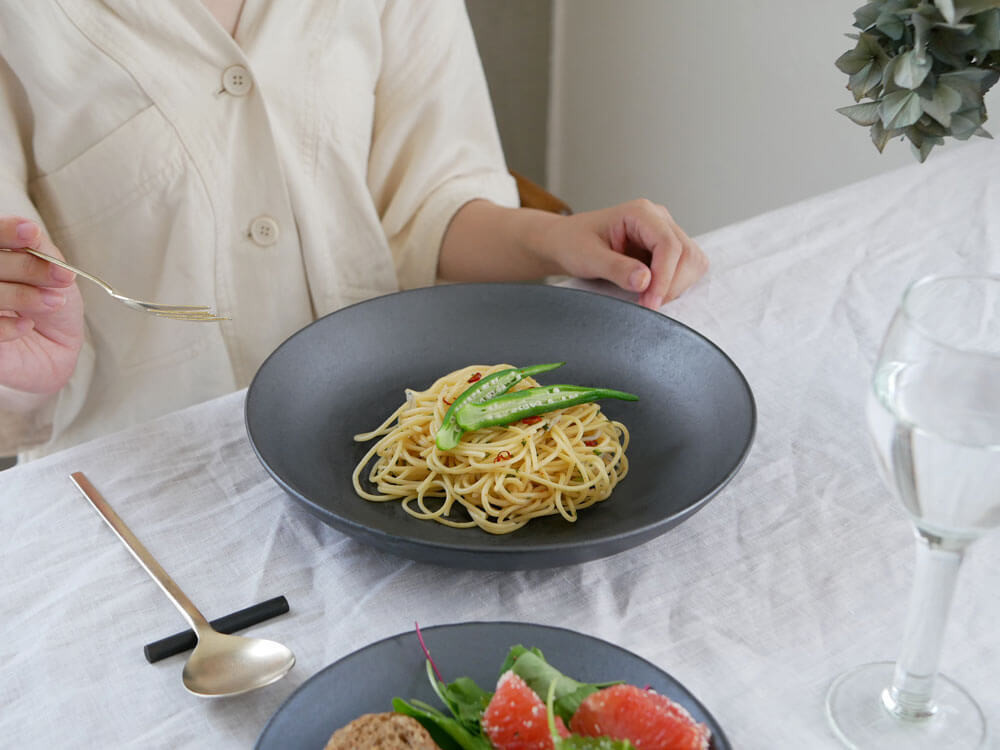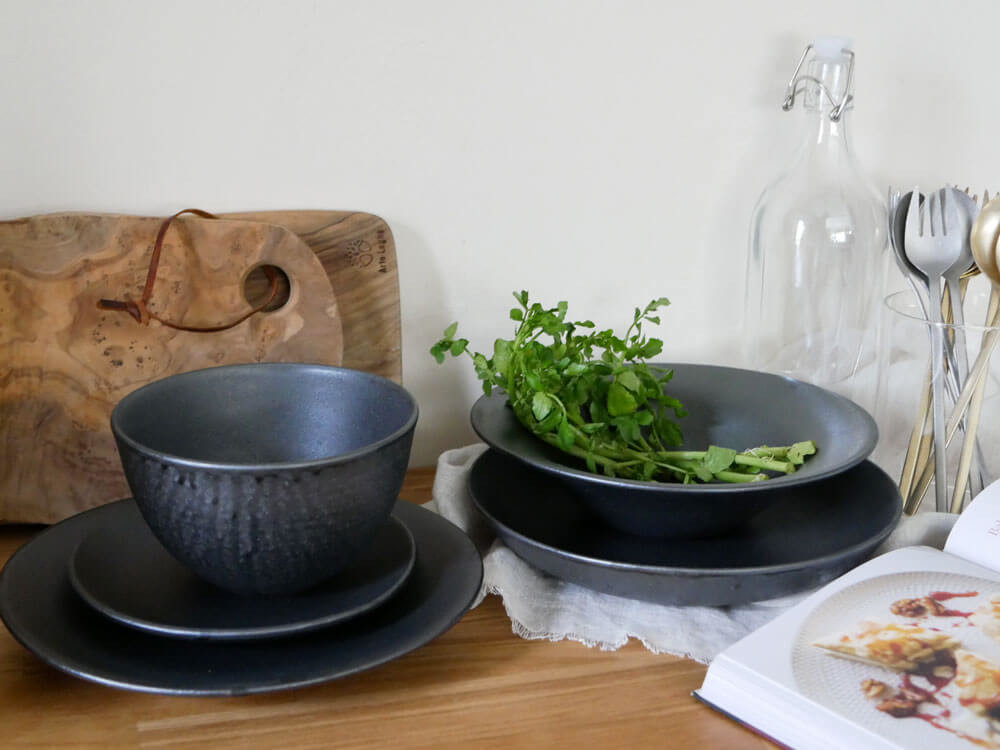 落ち着いた墨黒の器は、野菜やお肉などの色が引き立てられ、色鮮やかな色彩でより美味しそうに見えるんです。 ちょっと生活感を消してくれるから、おもてなしにも活躍しちゃいますよ。