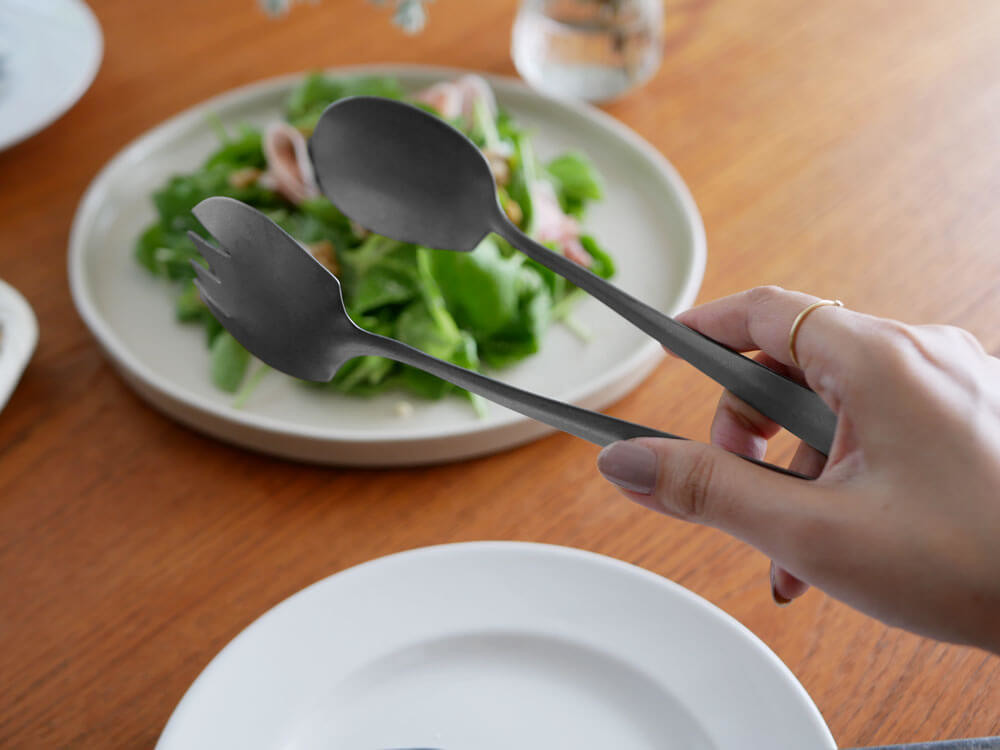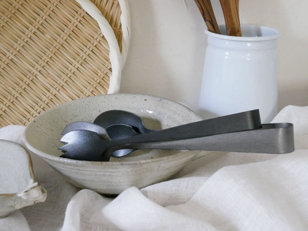 マットなステンレスの質感が、まるでヴィンテージ感を醸し出すトング「KURO サラダトング」。用途で使い分けられる2サイズで、いつもの食卓を希少価値のある時間へと演出してくれます。