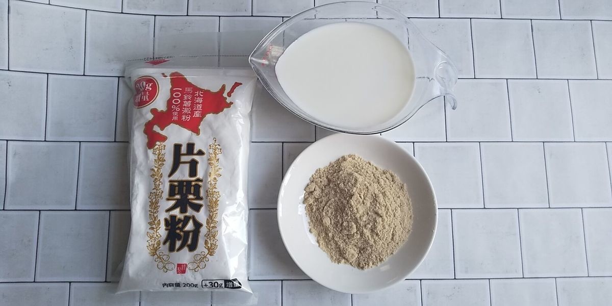 ①牛乳(200cc)・片栗粉(大さじ3)・砂糖(大さじ3)を鍋に入れ火にかける