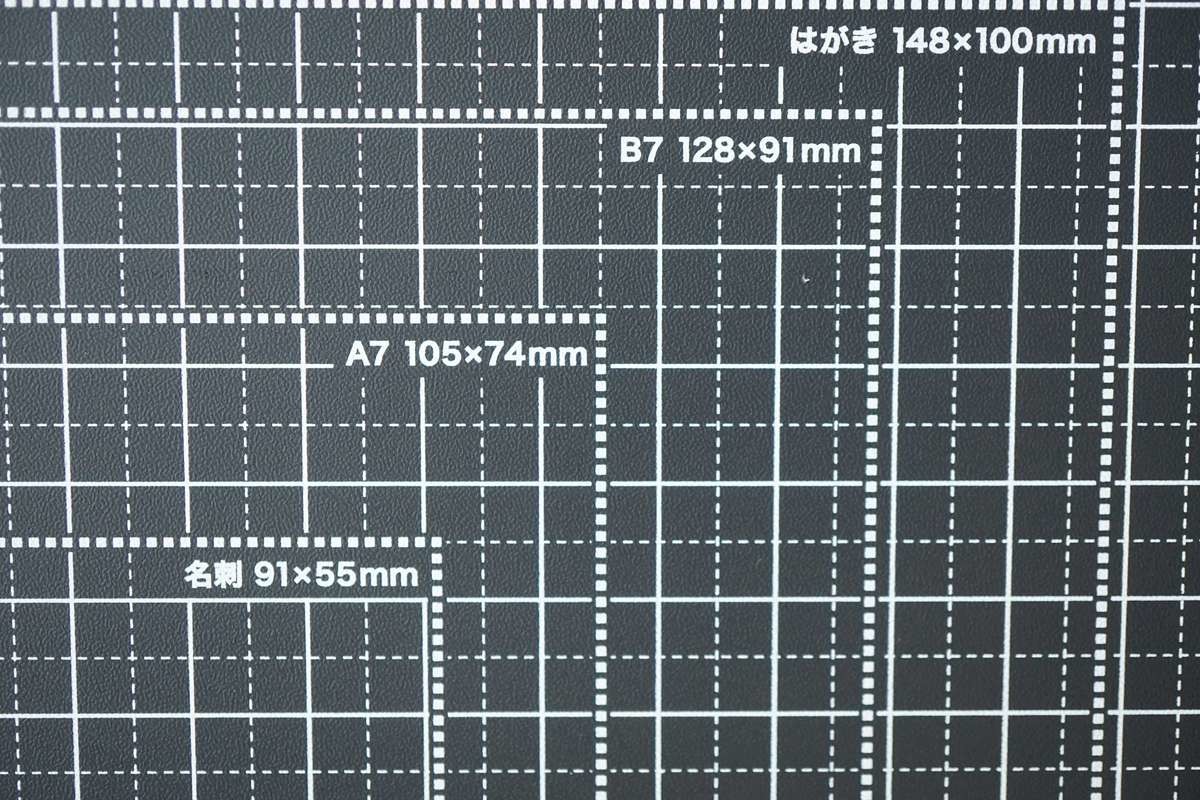さらに目盛りだけではなく、名刺・A7・B7・はがき・B6・A5・B5・A4サイズのガイドラインもついているので、目盛りだけのタイプよりカットがしやすくなっています。