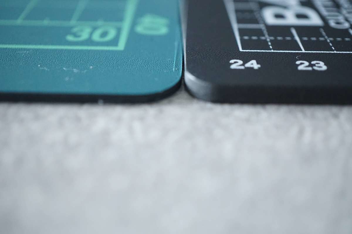 文房具店などでよく見かけるグリーンのカッターマットと比べると厚さが違うのがわかります。
