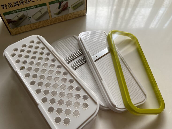 スライスした野菜はそのまま蓋をすれば、保存容器としても使える調理器具。輪切り、千切り、おろしができる3プレート。