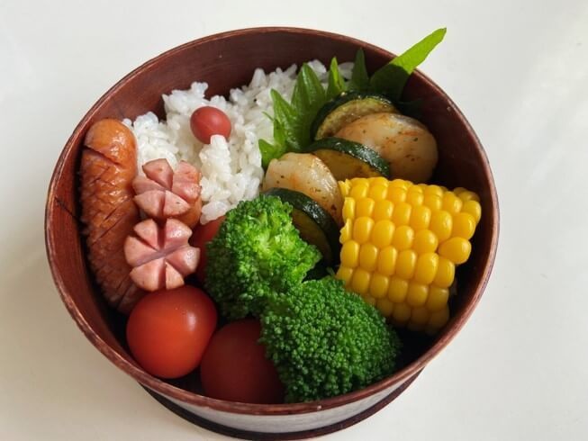ごはんとおかずを詰めて、ミニトマトを追加したら、たった10分でお弁当が完成です!