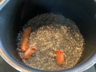 つづいて、ウインナーを追加。1分茹でたら、湯を捨て、油を足し、ウインナーをサッと炒めて焦げ目をつけます。火が通っているので、炒めるのも秒で完了!