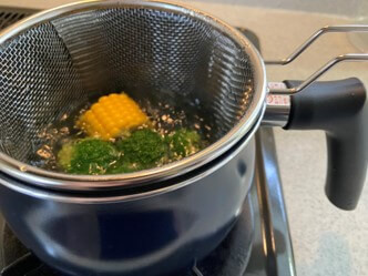 お弁当に詰めるぶんの野菜(ブロッコリー、とうもろこしなど)を湯に投入!「詰めるぶん」だけなら、即、火が通ります。茹であがったら、ストレーナーごとあげて、冷ますだけ。