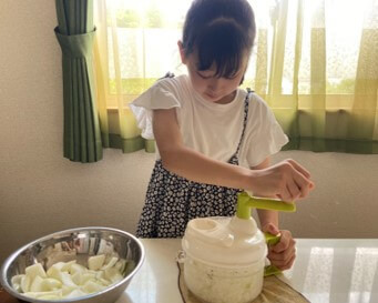 買ってきた玉ねぎをまるまる1袋、子どもに渡すと、ゲーム感覚で「楽しい~」と言いながら、みじん切りをしてくれます。