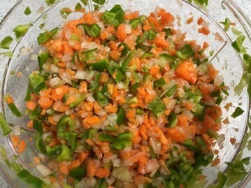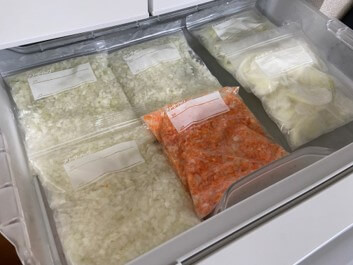 「玉ねぎストック」のほか、ピーマンやにんじん、玉ねぎなど「野菜ミックス」のみじん切りも、切り置き冷凍しておくと◎。
