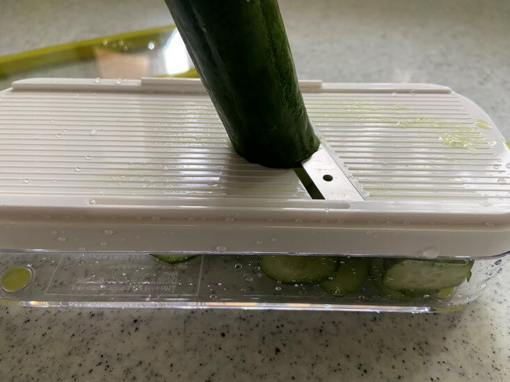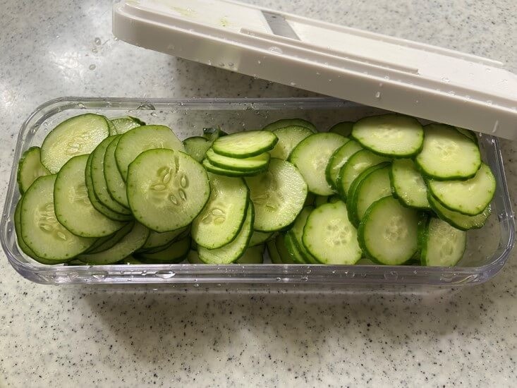 蓋がついていない野菜調理器セットが多い中、蓋さえあれば、スライスしたきゅうりやおろした大根など、そのまま冷蔵室で保存ができます。容器を移し替えなくていいから、よけいな洗い物もなし!