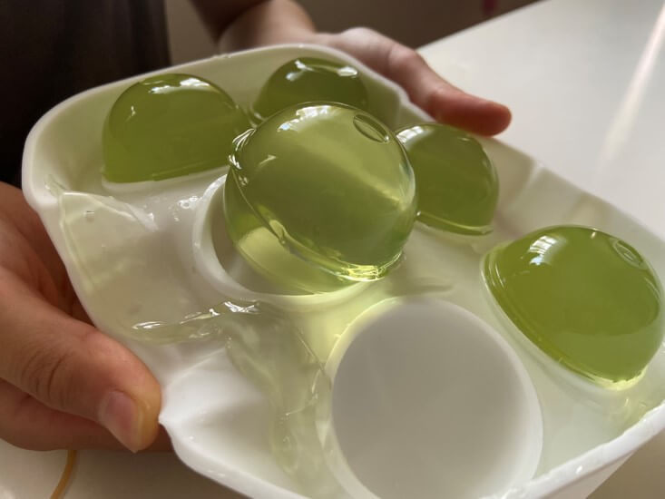そんなときに便利なのが、凍らせるだけの「丸氷がらうくれる製氷機」です。わが家では、100均などで売っている市販の素で「まんまるゼリー」をつくってみました。