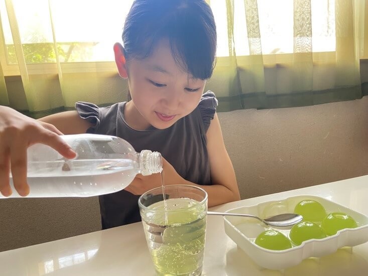 コップに入れて炭酸水を加えたら、「シュワシュワゼリー」の完成!まるでおしゃれなカフェのメニューのような特別感があります。丸い見た目が華やかで、子どもも「かわいい」と喜んでいました。