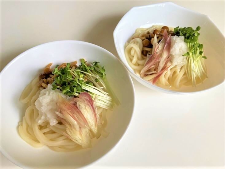 大根おろしをドンと乗せて薬味を添えれば、「サラダうどん」も完成。大根おろしがあれば、暑くて食欲がない日でもさっぱり食べられます。めんつゆをかけていただきます。