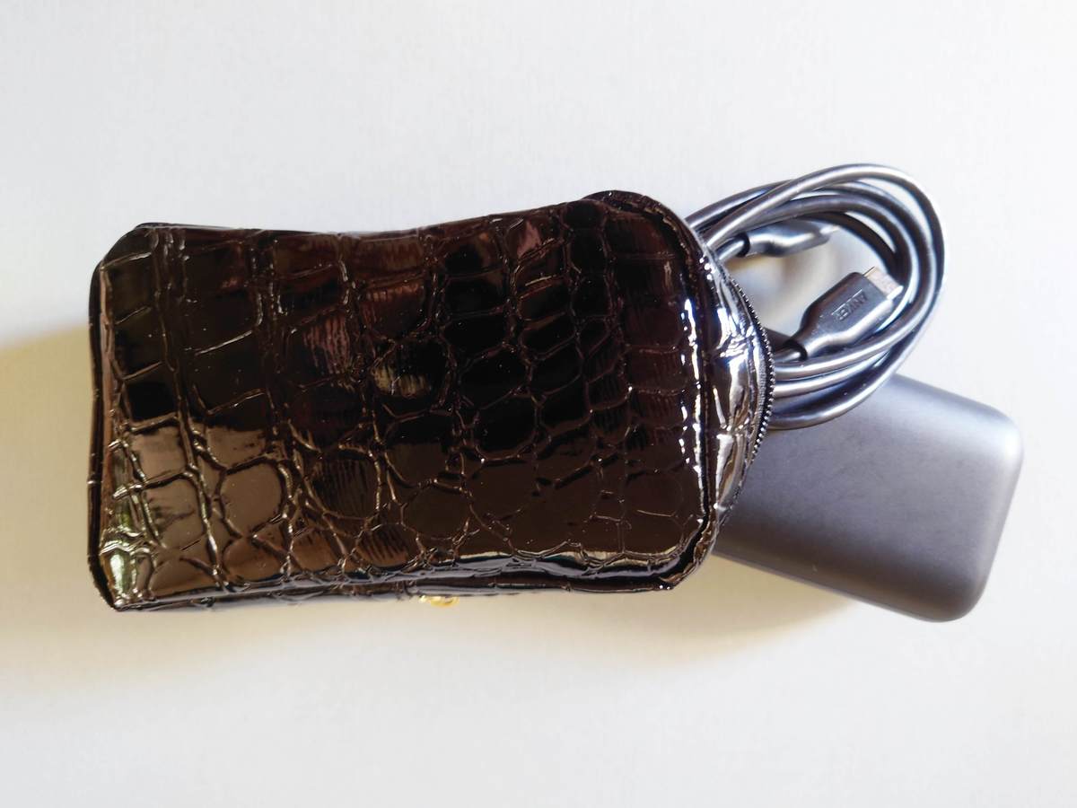 メイク用品や小物を入れるのに良さそうです。充電器もすっぽり入ります。バッグに入れても邪魔にならない大きさのポーチです。