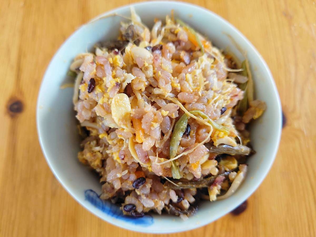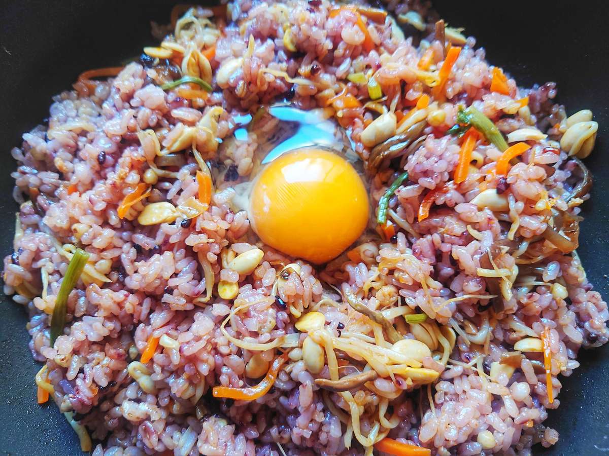 卵も落とせば、ボリュームもアップしよりおいしく食べられますよ。今回は、雑穀米で作っています。