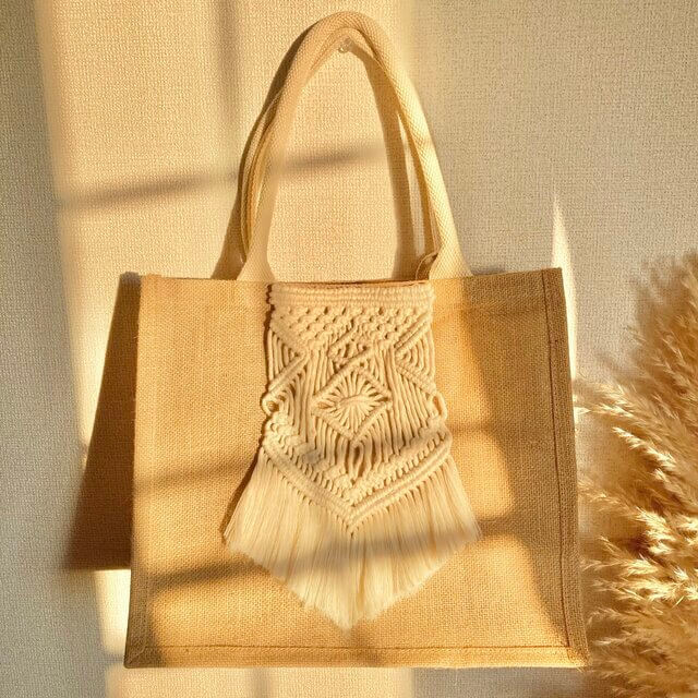 SNSでも大人気!西海岸のリゾート感満載の、ヘルシーなデザインが魅力的な「マクラメジュートバッグ」です。夏らしくもあり、冬に持ってもほっこり可愛いデザインなので、年中使えるデザインです。