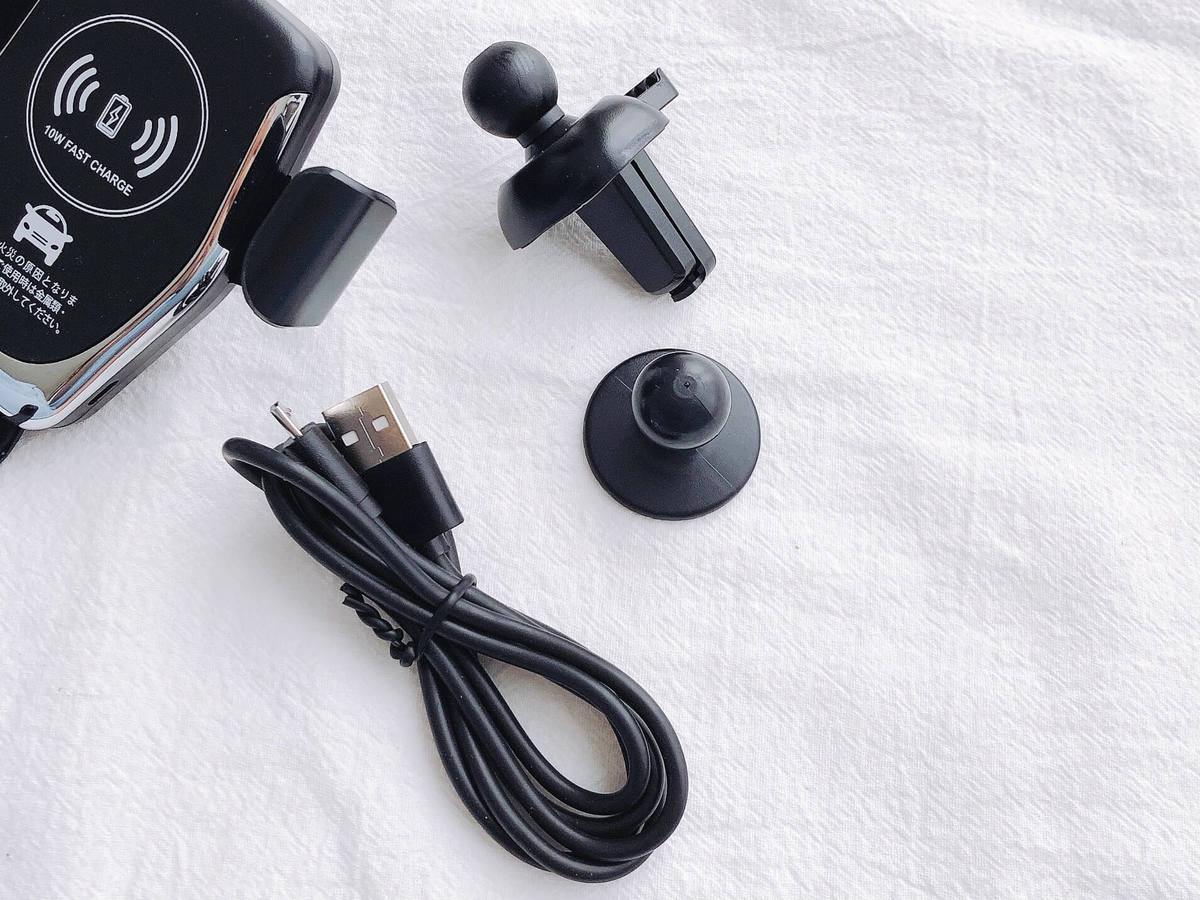 「車載ワイヤレスチャージャー」の付属パーツはこちらの4種類。