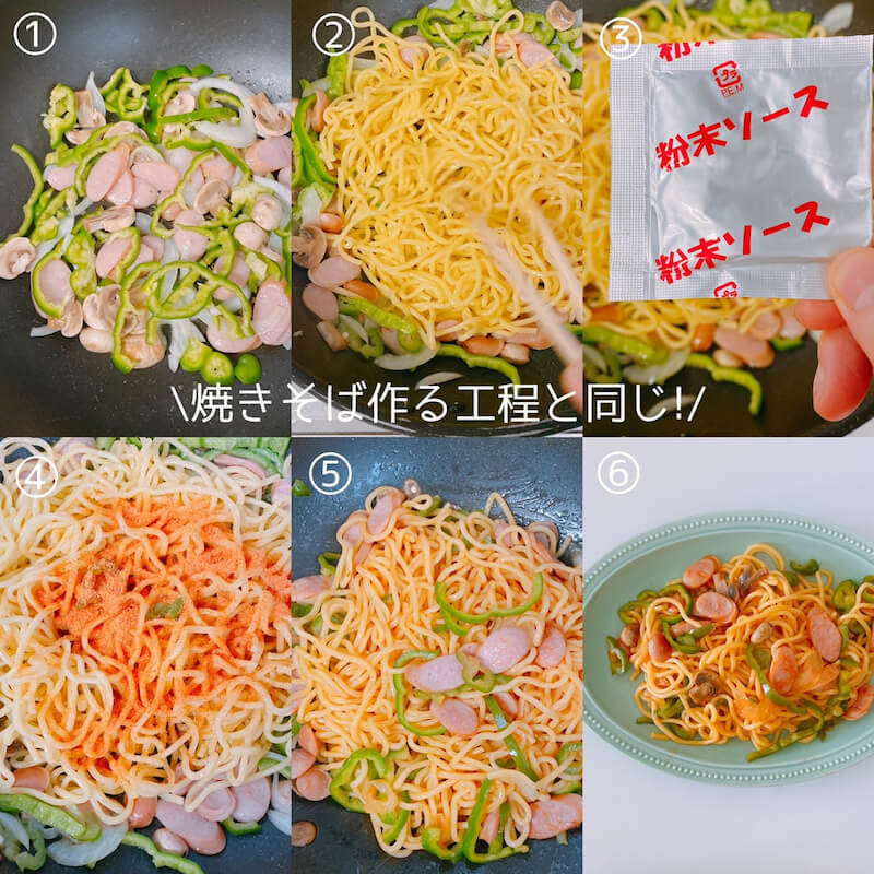 具材(玉ねぎ、ウインナー、ピーマン、マッシュルーム)を油で炒めて 30秒レンチンした麺を入れてほぐし、粉末ソースで和える。