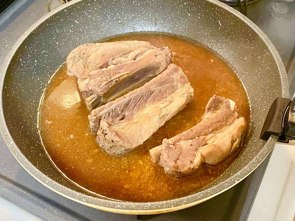 焼き目が付いている方が好みなので、湯煎した後にフライパンで調理していきます。