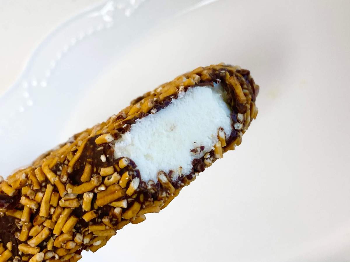 そして出てきたチョコアイスの表面には、いつものベビースターが何食わぬ顔でくっついているので、なんだか不思議な感覚に(笑)