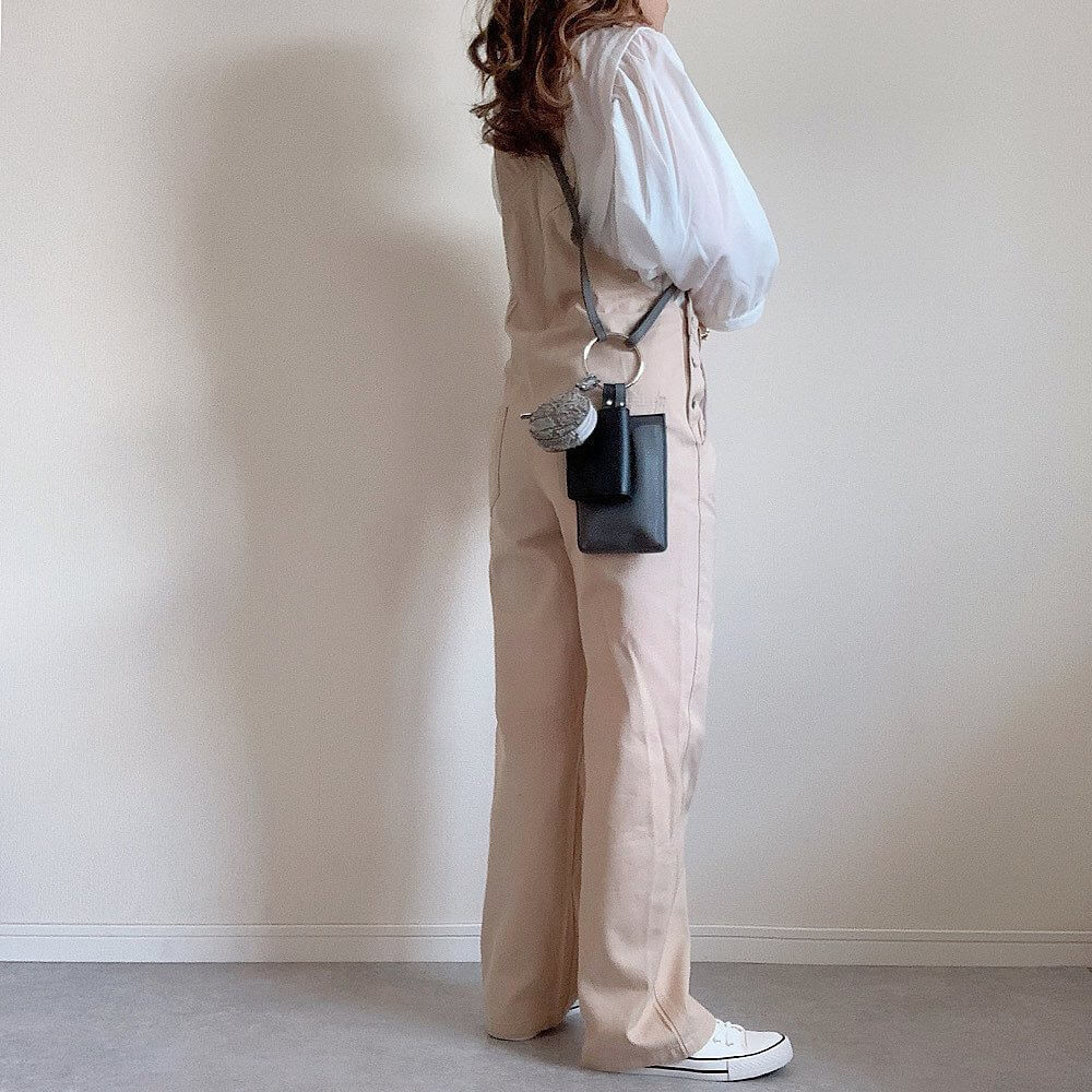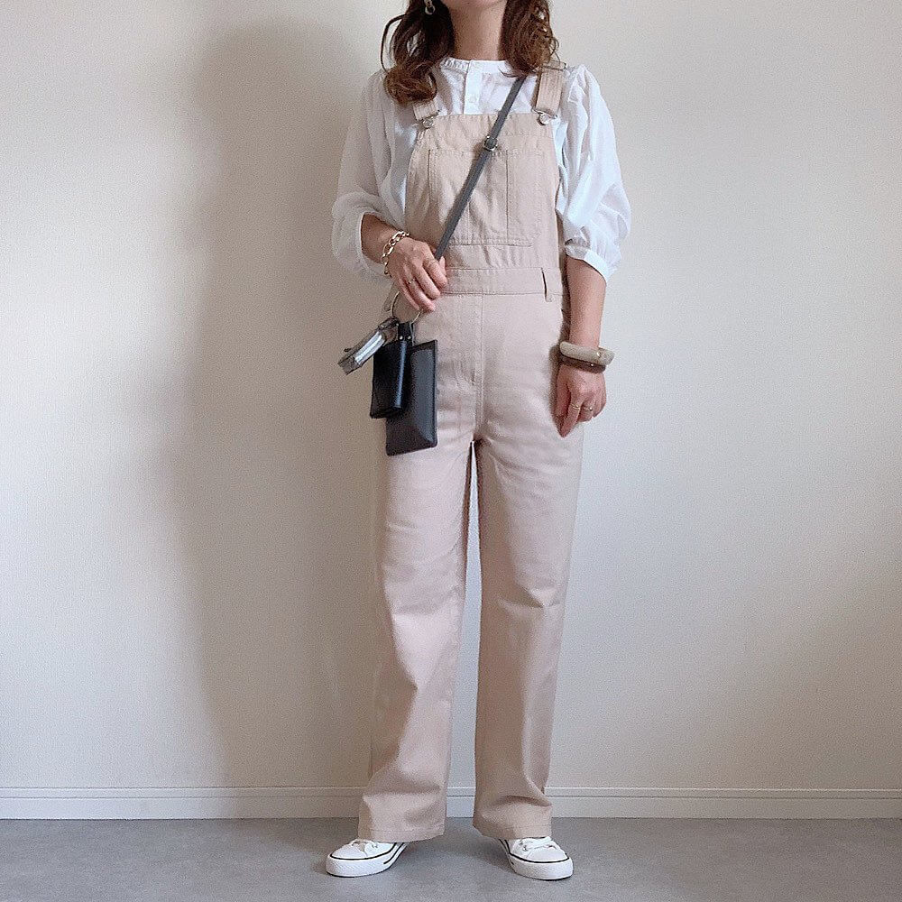 ベージュのオーバーオールと合わせたコーデで、ナチュラルな印象を演出。