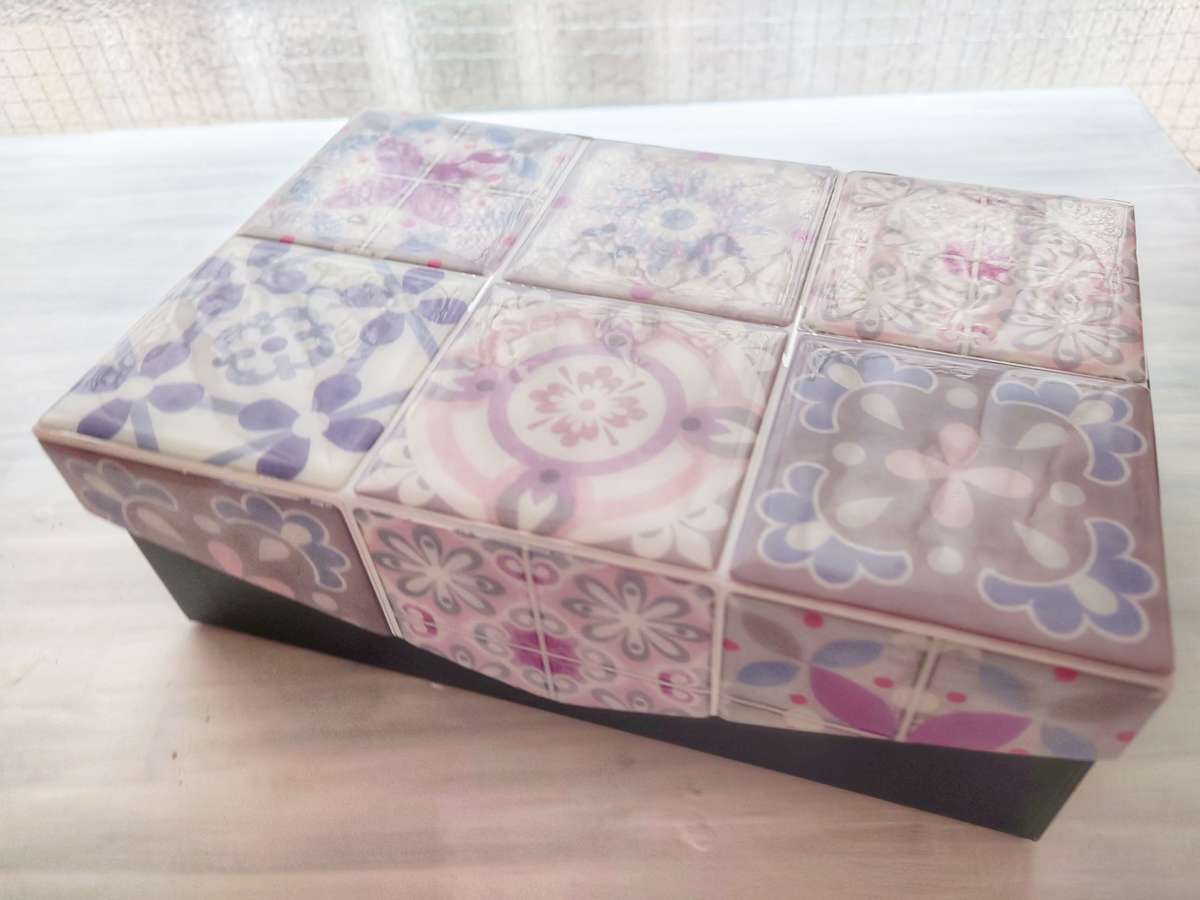 実際に、3Dタイルステッカーとリメイクテープの使い勝手を試してみようと、ペーパーボックスをリメイクしてみました。
