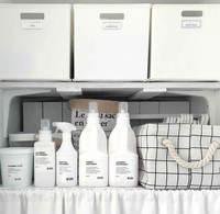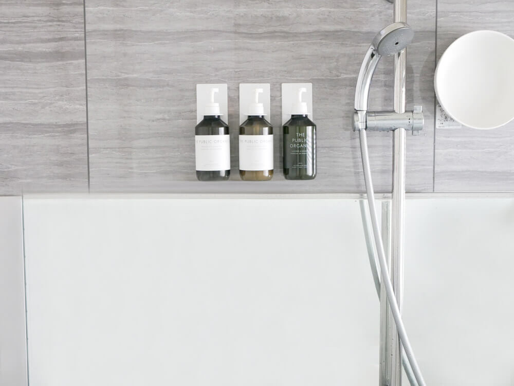 身体を洗うのは立ちながらなので上部に、シャンプーは座りながらなので低い位置に…と調節ができるのがGOOD。 そして何より、“浮かせ収納”なので一番ヌメリやすいボトル底が、いつでもカラッと綺麗なのが、お掃除を減らせるポイントですね♪