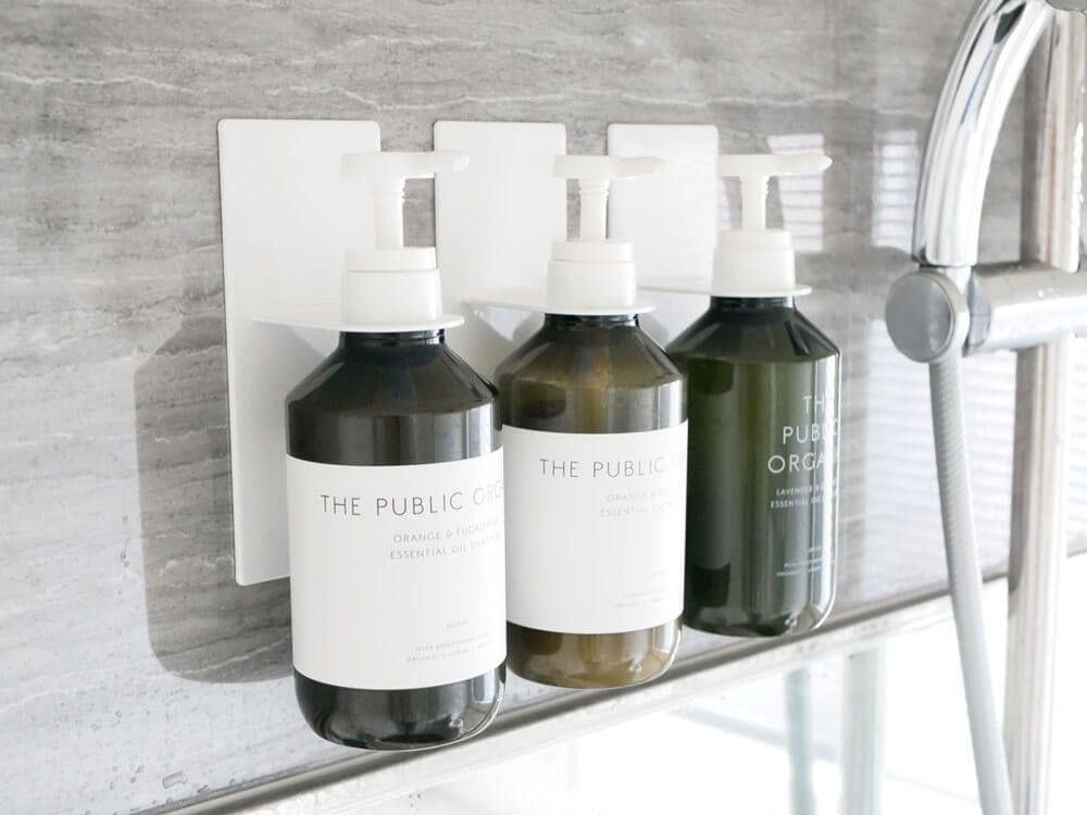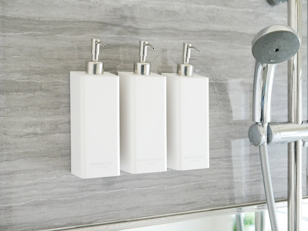 ボトルの裏面が全面強力マグネットになっており、直接液体ソープなどを入れてバシッと付けるだけ。 ボトルは、「SHAMPOO」「CONDITIONER」「BODY SOAP」の3タイプをご用意。主張しすぎず、見やすいロゴでしっかり使い分けできます。 3つ並べれば統一感が出て、バスルームがスッキリ整いますね。