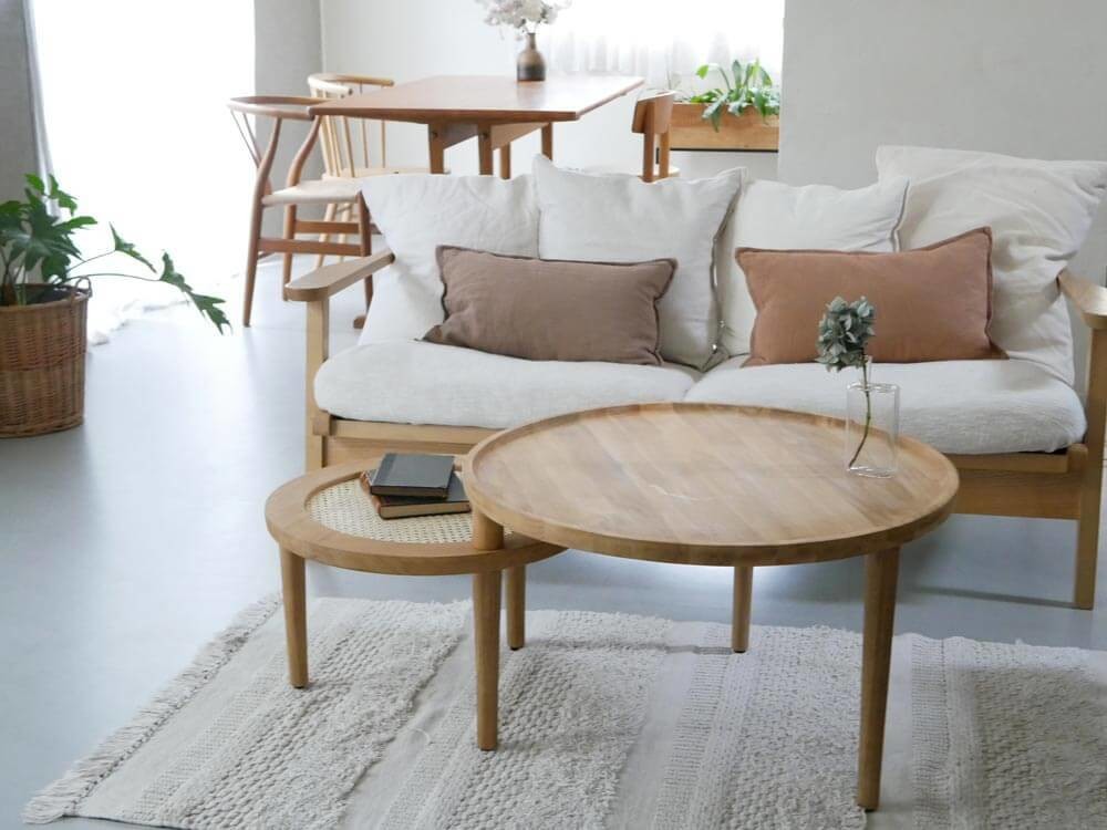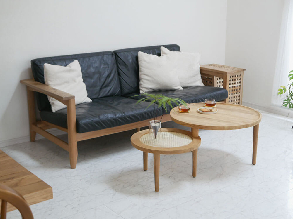 「センターテーブル KUURO」も目にするたび、使うたびに温かみを感じられる素材と形。 角のない円型のテーブルにすることで、ソファとテーブル間との境界をあいまいにし、空間を広げてくれる効果も。 部屋をできるだけ広く見せたい時にもオススメのアイテムです。